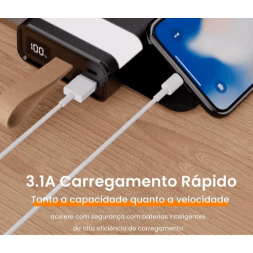 Com 20.000mAh de capacidade real, ele é ideal para carregar vários dispositivos ao mesmo tempo, contando com 4 cabos integrados e múltiplas saídas USB que eliminam a necessidade de fios extras.
