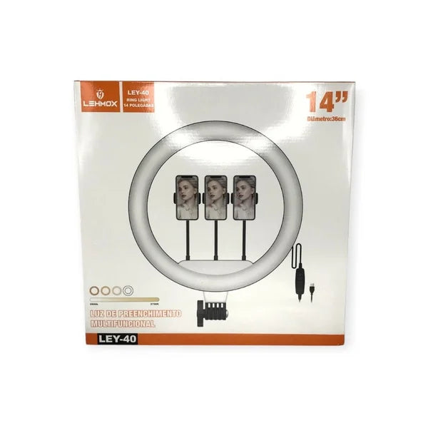Tamanho Ideal de 14 Polegadas: Com 36cm de diâmetro, proporciona uma luz de preenchimento uniforme que elimina sombras indesejadas.